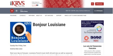 Diffusée depuis 1981, Bonjour Louisiane est une émission matinale emblématique de KRVS, animée par Colby LeJeune. Elle propose de la musique louisianaise en français, des annonces culturelles, des infos folkloriques et des chroniques d’élèves en immersion. Véritable rituel pour les francophones de Louisiane et d’ailleurs, elle célèbre la langue et la culture locales chaque matin de semaine dès 5h.