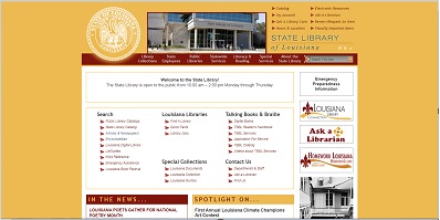 La bibliothèque d'État est une agence située à Bâton-Rouge qui offre aux Louisianais un accès à plus de onze millions d'articles grâce à sa propre excellente collection et à ses ressources électroniques combinées à un réseau de prêt en ligne de bibliothèques publiques à l'échelle de l'État. Le site internet présente la bibliothèque et son catalogue et propose des ressources électroniques.