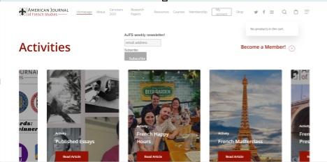 L'American Journal of French Studies valorise la francophonie nord-américaine à travers des publications, activités et ressources pédagogiques. Il propose des essais, entretiens, masterclasses et bulletins hebdomadaires, dans une mise en page sobre et structurée. L’ensemble reflète une volonté de transmission active, avec un ancrage dans la langue française comme vecteur de culture et de dialogue. C’est une plateforme éditoriale qui articule recherche, pédagogie et valorisation des initiatives francophones régionales.