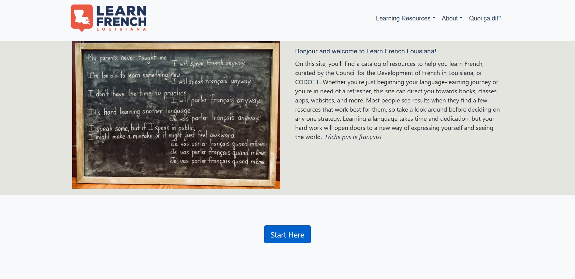 Le site Learn French Louisiana, géré par le CODOFIL, propose un large éventail de ressources pour apprendre le français : livres, cours, applis, sites web... Il s’adresse à tous, débutants ou francophones en quête de rappel. L’objectif est d’aider chacun à trouver une méthode adaptée et motivante. Ce portail encourage l’apprentissage actif et souligne la valeur culturelle de la langue française en Louisiane.